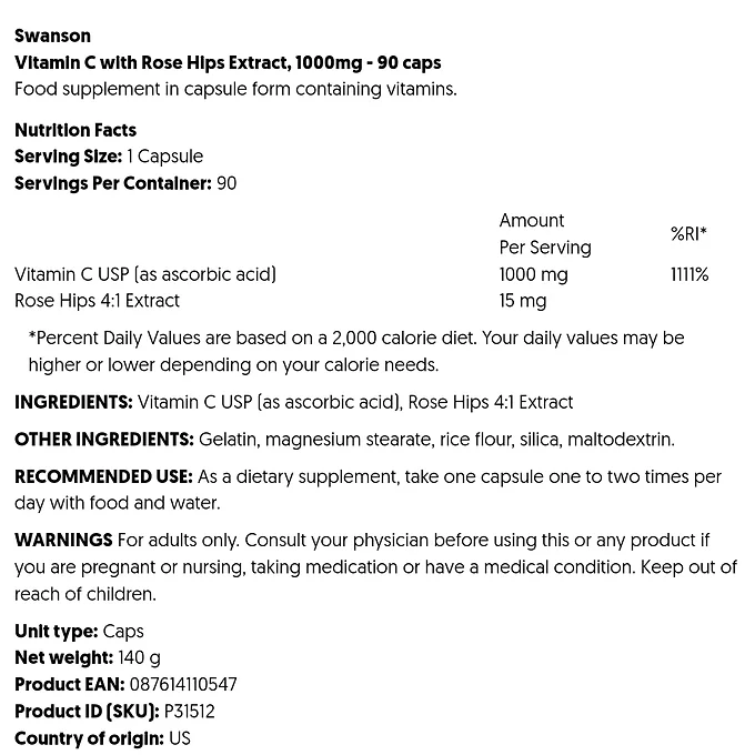Swanson C-vitamin med nypon är det perfekta paret för att ge ditt immunförsvar en boost av antioxidanter. Dessa bekväma kapslar fungerar fenomenalt när du är på språng eller hemma för att stärka ditt immunförsvar.