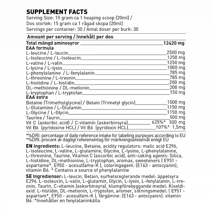 EAA Engine från Swedish Supplements ger hela 12 420 mg aminosyror. Utöver detta är flera andra värdefulla ämnen tillsatta så som betain (trimetylglycin), vitamin B6 och C-vitamin. EAA Engine kommer i två fantastiska smaker och passar perfekt att ha med i gymväskan.