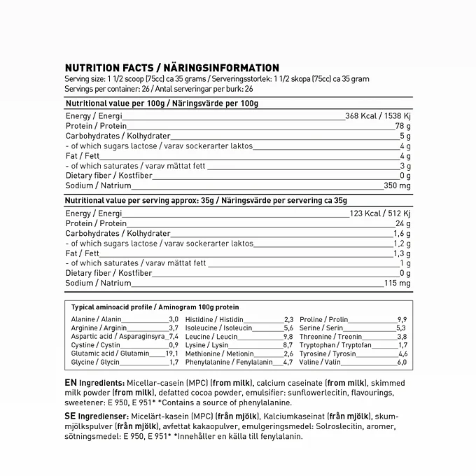 Swedish Supplements är ett varumärke som på kort tid gjort sig kända för att leverera kosttillskott i toppklass. Deras Slow Casein är inget undantag. Slow Casein är ett rent kaseinprotein av hög kvalitet. Varje portion ger så mycket som 26 gram protein, men bara drygt 1,5 gram kolhydrater och fett.