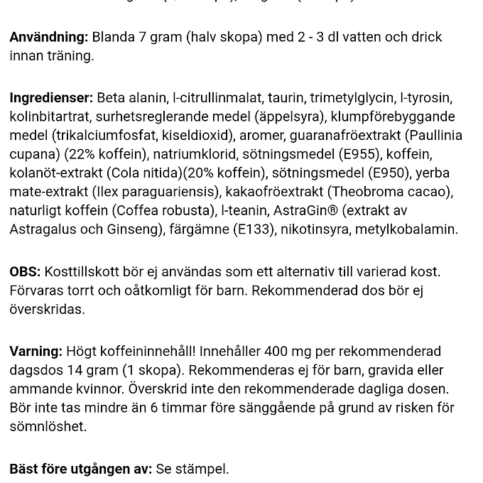 Rekommenderad daglig dos: Blanda 0,5 – 1 skopa (7 – 14 g) med 3 dl vatten och drick ca 30 minuter före träning. Överskrid ej rekommenderad daglig dos.