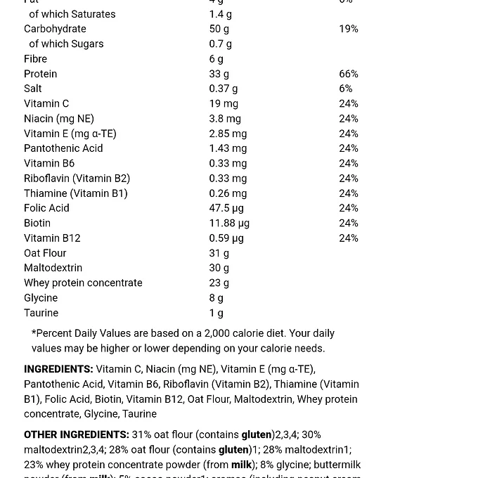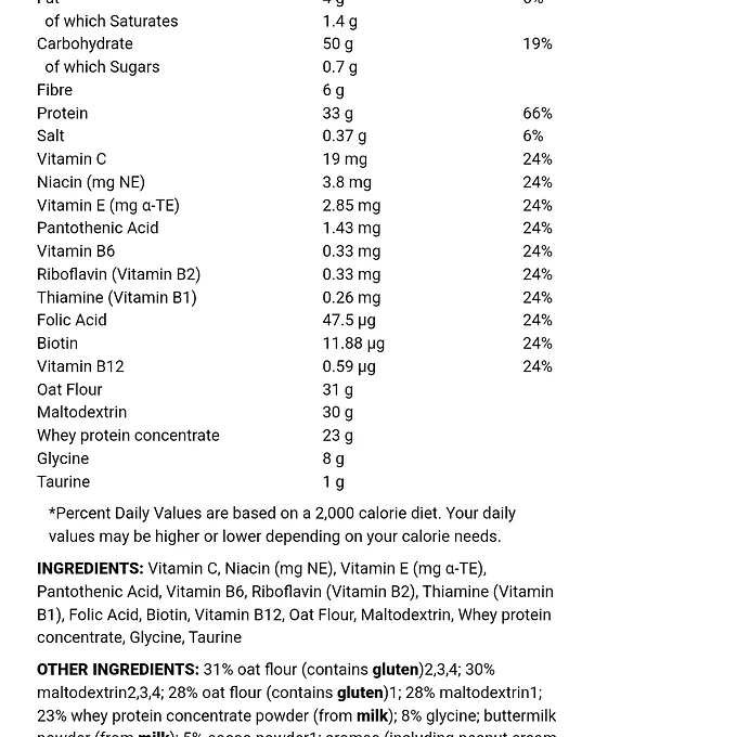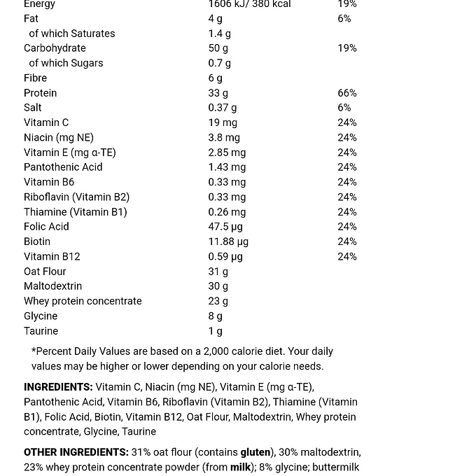 Varje 100 g portion av tillägget har 33 g protein med lite mer än kolhydrater 50 g, nästan inget av sockret på under ett gram, 4 g fett och ett relativt rent kaloriantal på 380.