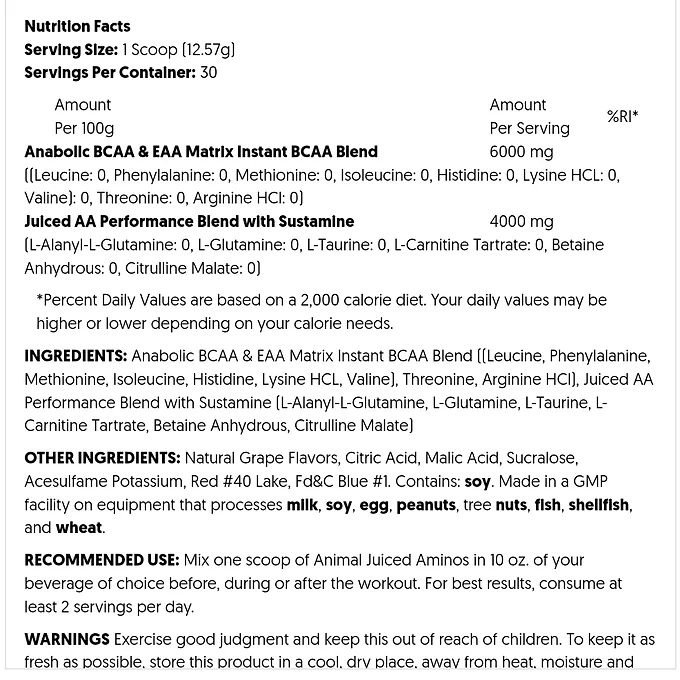 Som byggstenarna i protein är aminosyror avgörande för tillväxten av muskelvävnad. Animal Juiced Aminos är speciellt utformad för att ge effektiva doser av de viktigaste anabola aminosyrorna, inklusive grenade aminosyror (BCAA) och essentiella aminosyror (EAA). Denna kraftfulla aminosyreblandning hjälper till att främja muskelproteinsyntesen och påskynda återhämtningsprocessen efter träning.