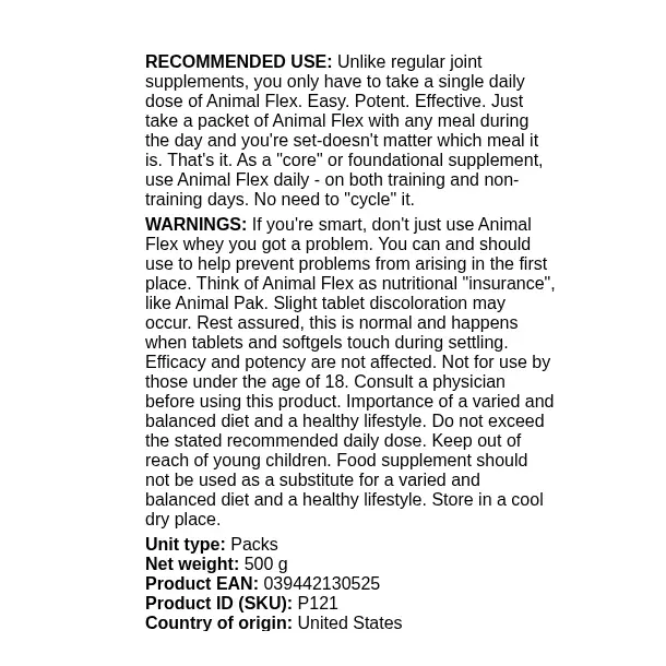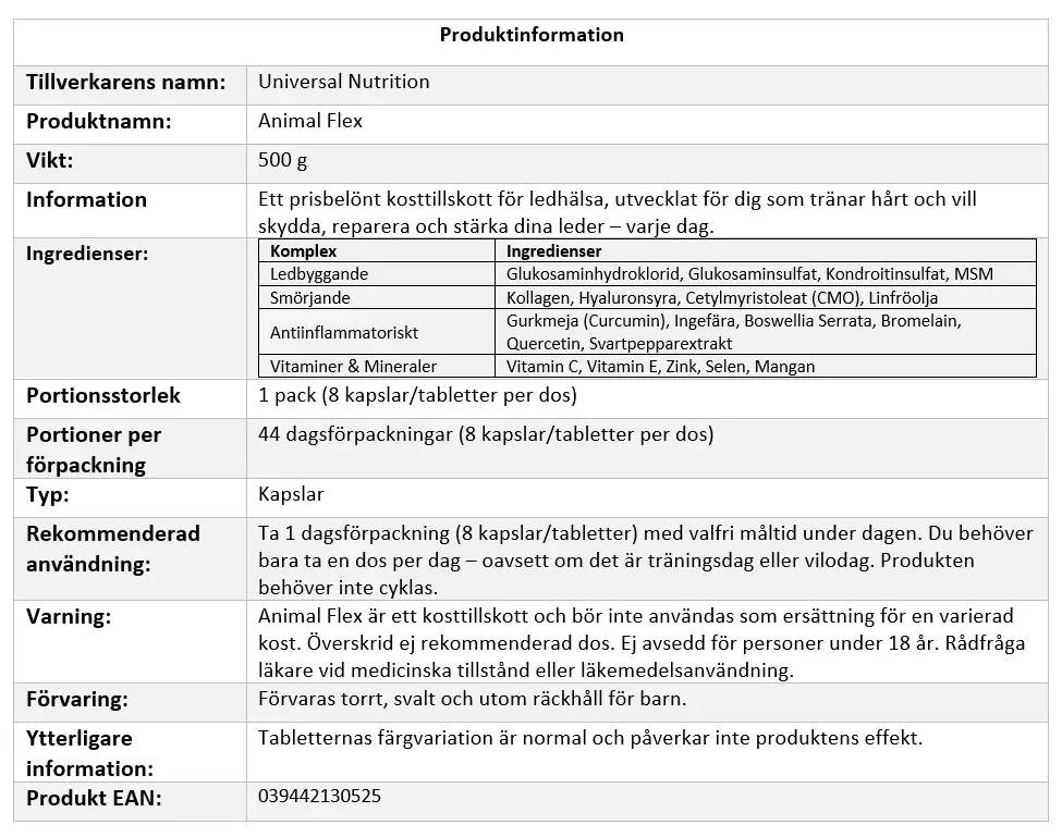 Animal Flex är ett kosttillskott och bör inte användas som ersättning för en varierad kost. Överskrid ej rekommenderad dos. Ej avsedd för personer under 18 år. Rådfråga läkare vid medicinska tillstånd eller läkemedelsanvändning. Förvaras torrt, svalt och utom räckhåll för barn. Tabletternas färgvariation är normal och påverkar inte produktens effekt.