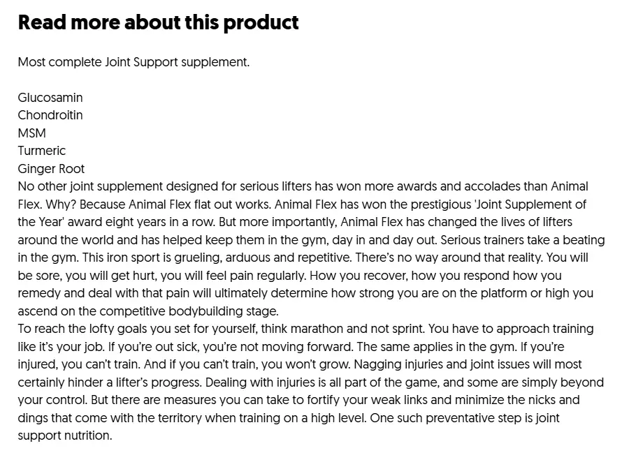 Animal Flex är ett komplett ledtillskott som är utformat för att stödja flera skyddande mekanismer i kroppen – från reparation av brosk till smörjning av leder och minskning av inflammation. Varje dos innehåller en noggrant sammansatt blandning av byggstenar för leder, antiinflammatoriska växtextrakt, smörjande ämnen och essentiella vitaminer och mineraler. Det är inte ett vanligt tillskott – det är ett fundamentalt verktyg för dig som tränar tungt och regelbundet. Animal Flex har vunnit utmärkelsen ”Joint Supplement of the Year” åtta år i rad, och har hjälpt tusentals atleter världen över att hålla sig skadefria och fortsätta träna dag efter dag.