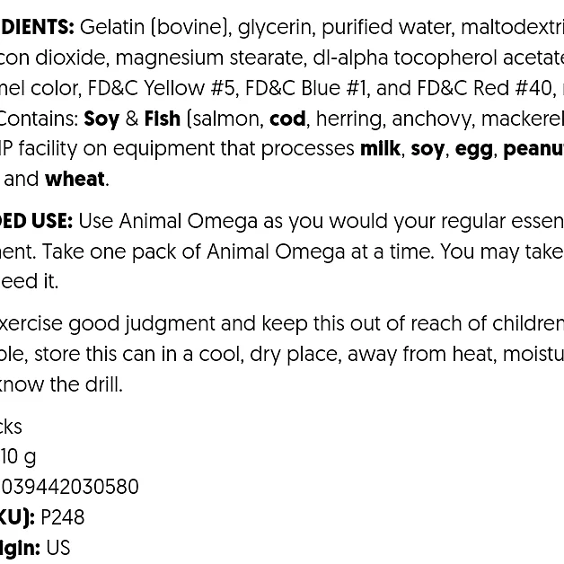 Rekommenderad användning: Använd Animal Omega som ditt vanliga tillskott av essentiell fettsyra (EFA). Ta ett paket Animal Omega i taget. Du kan ta upp till två dagligen, efter behov.