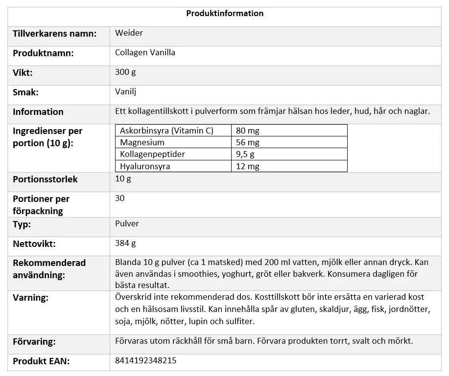 Upptäck hur Weider Collagen Vanilla kan bli en del av din dagliga hälsorutin. Med sin goda smak och kraftfulla formula är det ett enkelt sätt att ta hand om dig själv – inifrån och ut. Klicka hem din burk idag och ge din kropp det stöd den förtjänar!