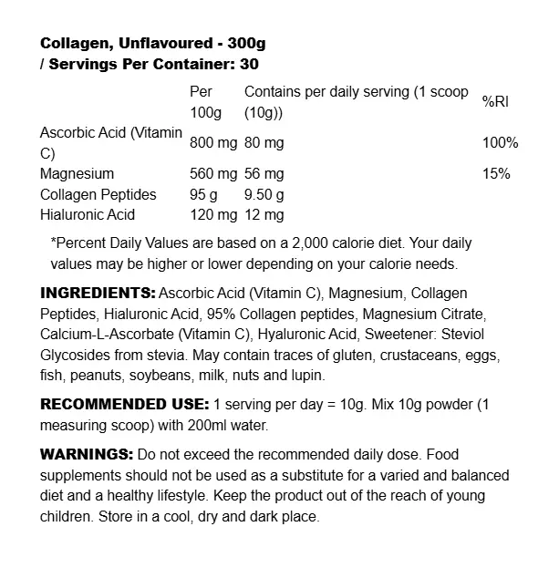 ✅ Komplett formula med synergistiska ingredienser: Kombinationen av kollagen, hyaluronsyra, magnesium och vitamin C är noggrant utformad för att ge ett heltäckande stöd för kroppens bindväv, hud och muskelhälsa. Ingredienserna arbetar tillsammans för att förstärka varandras effekter, vilket gör produkten mer effektiv än enskilda tillskott.