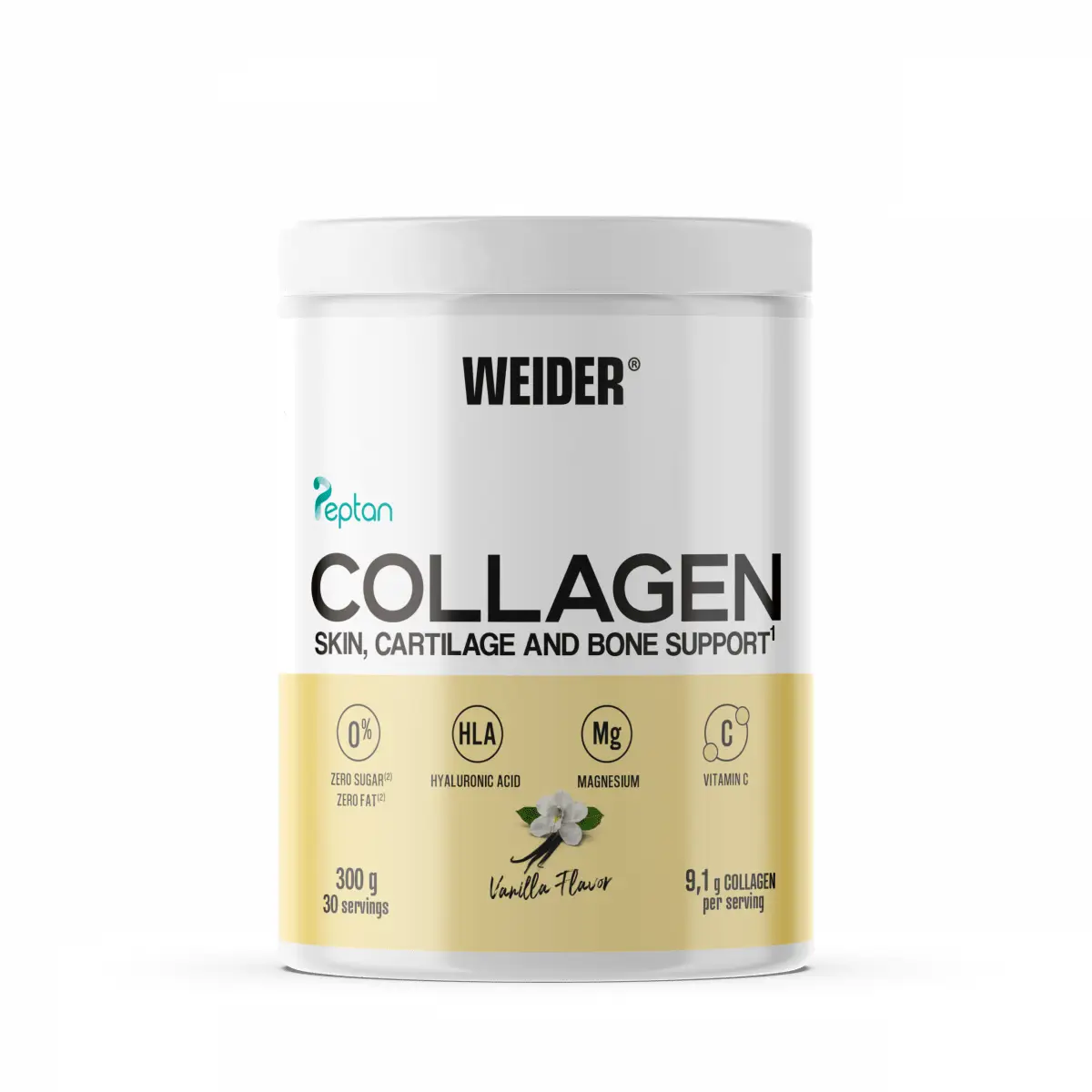 Weider Collagen Vanilla 300g är ett kollagentillskott i pulverform som främjar hälsan hos leder, hud, hår och naglar. Tack vare hydrolyserat kollagen (Peptan®) absorberas det lätt av kroppen. Den lena vaniljsmaken gör det till ett njutbart inslag i din dagliga rutin.