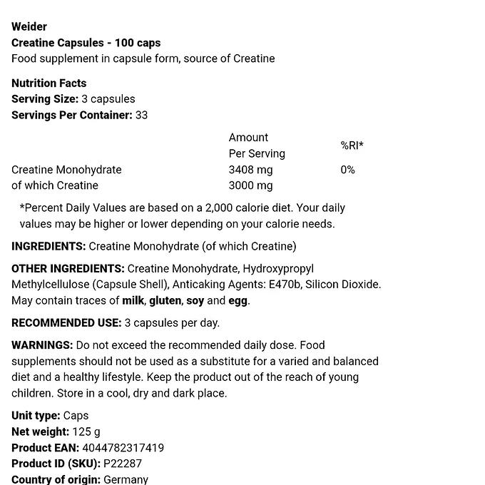 Kreatinmonohydrat, som finns i Weider Creatine Capsules, är en föregångare till kreatinfosfat (CP), som fungerar som ett viktigt energisubstrat för musklerna under intensiv träning. Genom att komplettera med kreatin kan du öka kreatinfosfatnivåerna i dina muskler, vilket bidrar till ökad muskelkraft och förbättrad prestation vid aktiviteter med maximal intensitet. Studier har visat att kreatintillskott kan öka styrkan och ge bättre resultat vid explosiva och kortvariga aktiviteter, som tyngdlyftning och sprint. Detta gör Weider Creatine Capsules till ett utmärkt val för idrottare och fitnessentusiaster som strävar efter att förbättra sin fysiska prestation.
