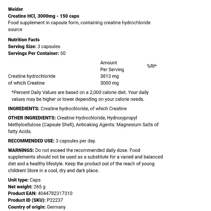 Weider Creatine HCl är utformad för att ge en ökad prestationshastighet under träning. Kreatinhydroklorid är en kraftfull form av kreatin som snabbt absorberas av kroppen. Genom att använda denna produkt kan du förbättra din uthållighet och intensitet under träningen, vilket kan leda till bättre resultat och snabbare framsteg.
