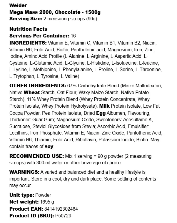 Mega Mass 2000 är ett kosttillskott och bör användas som en del av en hälsosam livsstil. Rådgör med läkare eller näringsrådgivare innan du gör större förändringar i din diet. Produkten innehåller mjölk och soja. Förvaras torrt och svalt. Konsumeras enligt rekommendation.