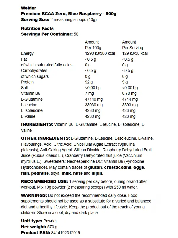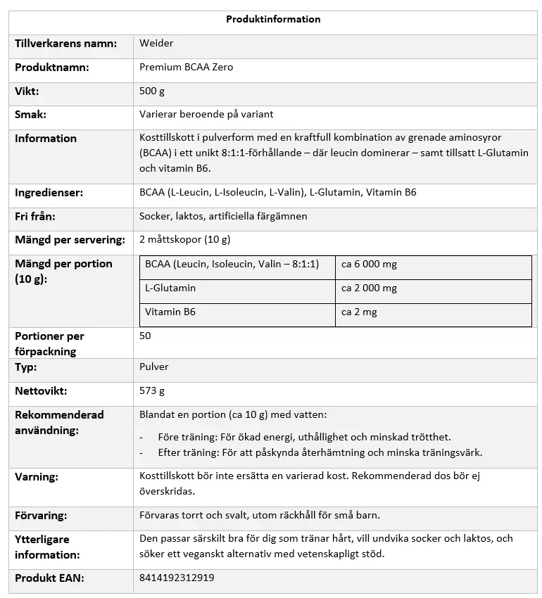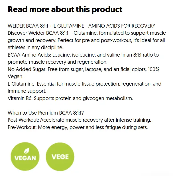 Oavsett om du vill bygga muskler, återhämta dig snabbare eller skydda kroppen under hård träning, är Weider BCAA 8:1:1 + L-Glutamin ett smart och effektivt val. Med sin kraftfulla formula och rena innehåll är det dags att ta din träning till nästa nivå – beställ idag och upplev skillnaden!